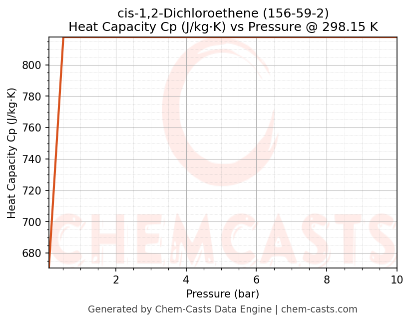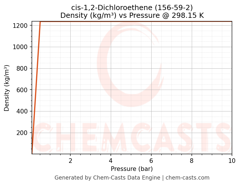 This page presents the pressure-dependent thermodynamic and transport properties of cis-1,2-Dichloroethene (CAS 156-59-2) calculated at a constant temperature of 298 K (25 °C) over the pressure range 0.10-10 bar.