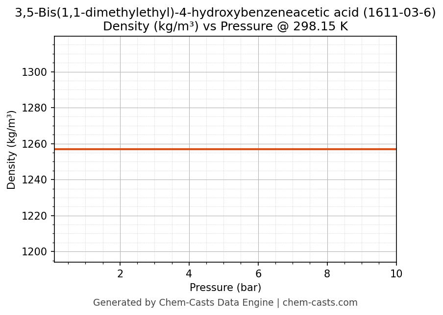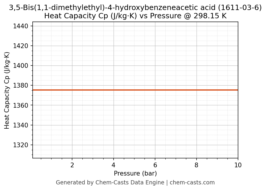 This page presents the pressure-dependent thermodynamic and transport properties of 3,5-Bis(1,1-dimethylethyl)-4-hydroxybenzeneacetic acid (CAS 1611-03-6) calculated at a constant temperature of 298 K (25 °C) over the pressure range 0.10-10 bar.
