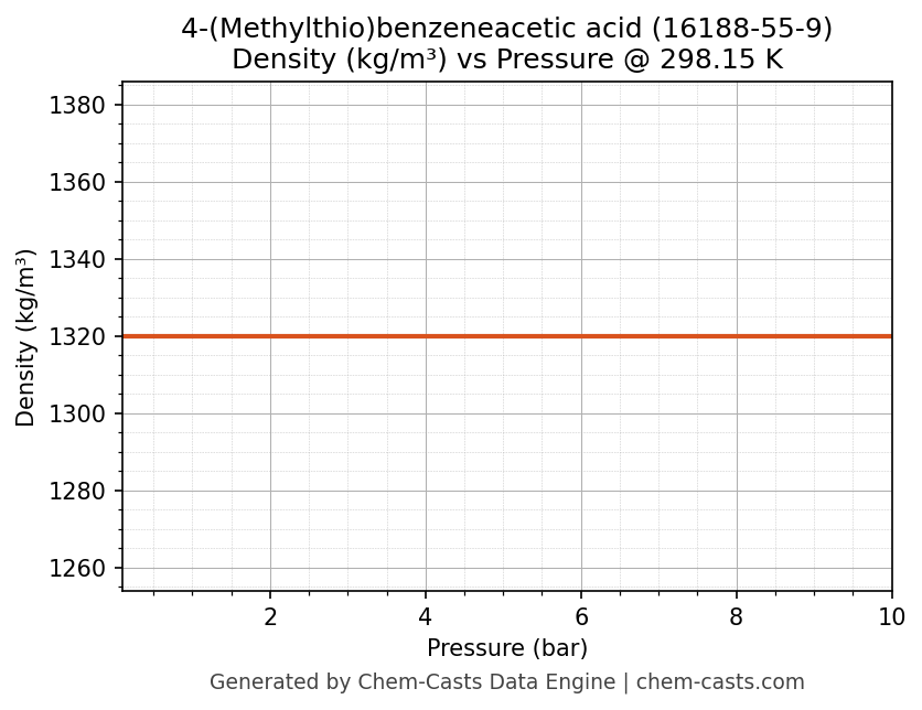 This page presents the pressure-dependent thermodynamic and transport properties of 4-(Methylthio)benzeneacetic acid (CAS 16188-55-9) calculated at a constant temperature of 298 K (25 °C) over the pressure range 0.10-10 bar.
