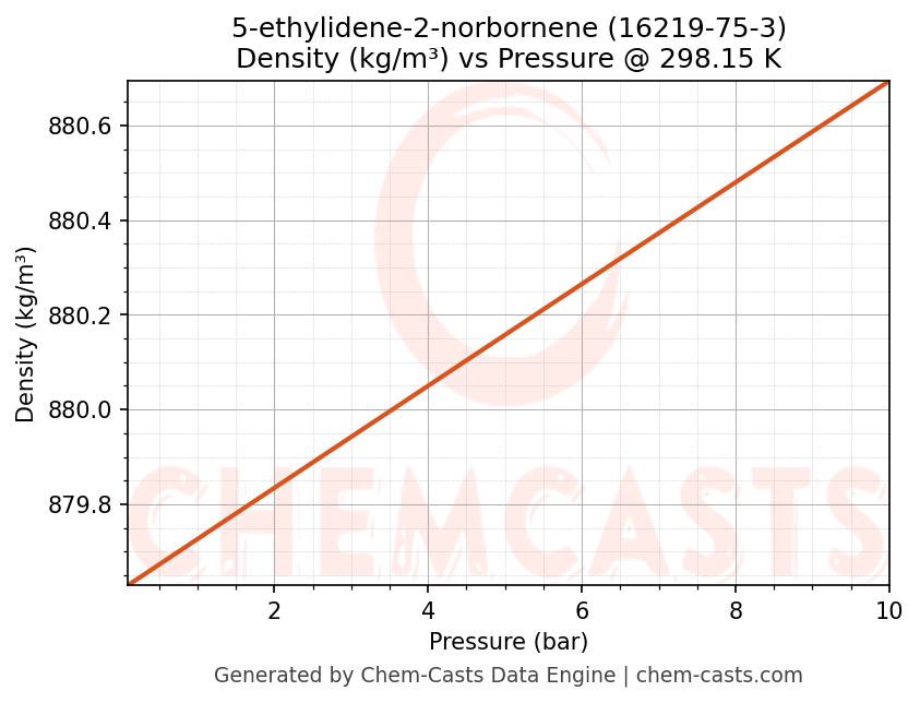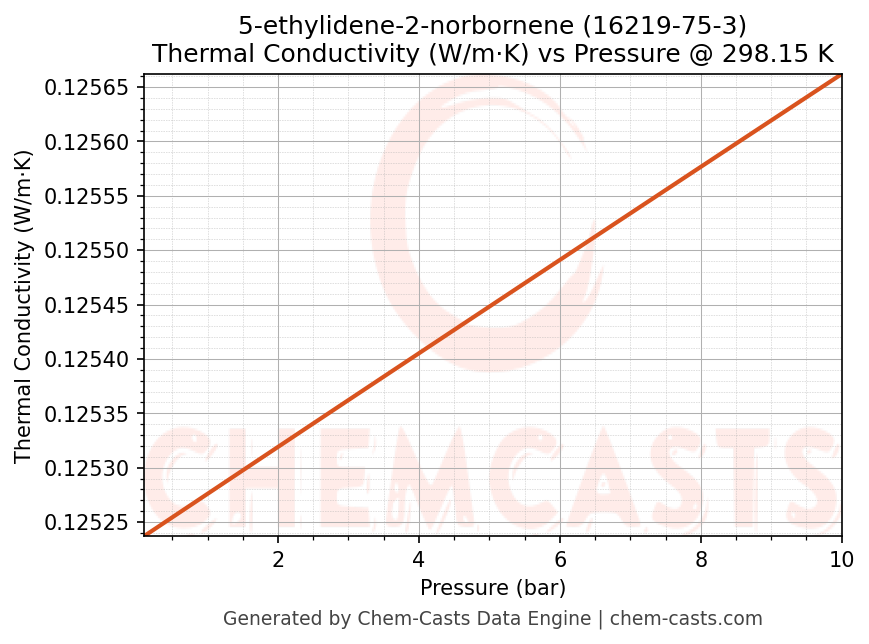 This page presents the pressure-dependent thermodynamic and transport properties of 5-ethylidene-2-norbornene (CAS 16219-75-3) calculated at a constant temperature of 298 K (25 °C) over the pressure range 0.10-10 bar.