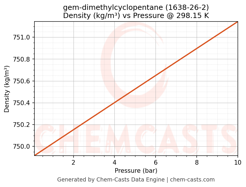 This page presents the pressure-dependent thermodynamic and transport properties of gem-dimethylcyclopentane (CAS 1638-26-2) calculated at a constant temperature of 298 K (25 °C) over the pressure range 0.10-10 bar.