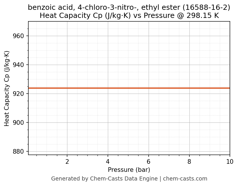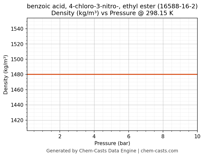 This page presents the pressure-dependent thermodynamic and transport properties of benzoic acid, 4-chloro-3-nitro-, ethyl ester (CAS 16588-16-2) calculated at a constant temperature of 298 K (25 °C) over the pressure range 0.10-10 bar.