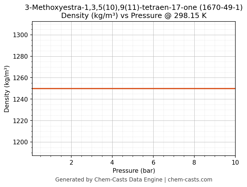 This page presents the pressure-dependent thermodynamic and transport properties of 3-Methoxyestra-1,3,5(10),9(11)-tetraen-17-one (CAS 1670-49-1) calculated at a constant temperature of 298 K (25 °C) over the pressure range 0.10-10 bar.