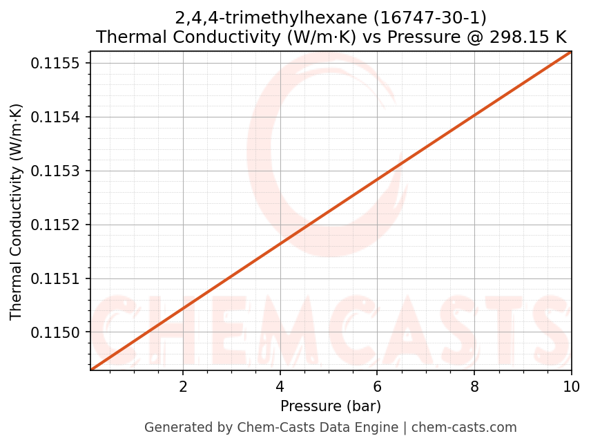 This page presents the pressure-dependent thermodynamic and transport properties of 2,4,4-trimethylhexane (CAS 16747-30-1) calculated at a constant temperature of 298 K (25 °C) over the pressure range 0.10-10 bar.