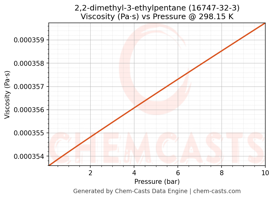 This page presents the pressure-dependent thermodynamic and transport properties of 2,2-dimethyl-3-ethylpentane (CAS 16747-32-3) calculated at a constant temperature of 298 K (25 °C) over the pressure range 0.10-10 bar.