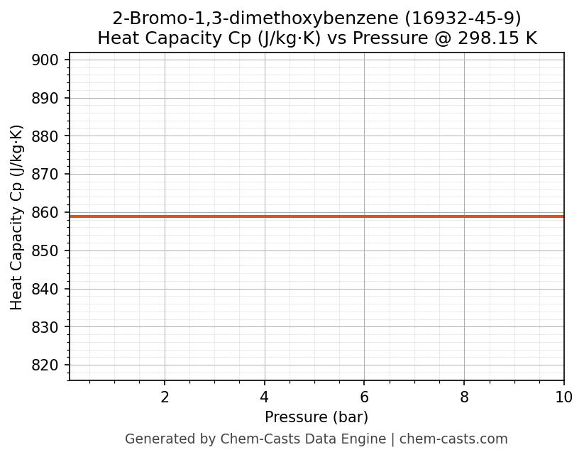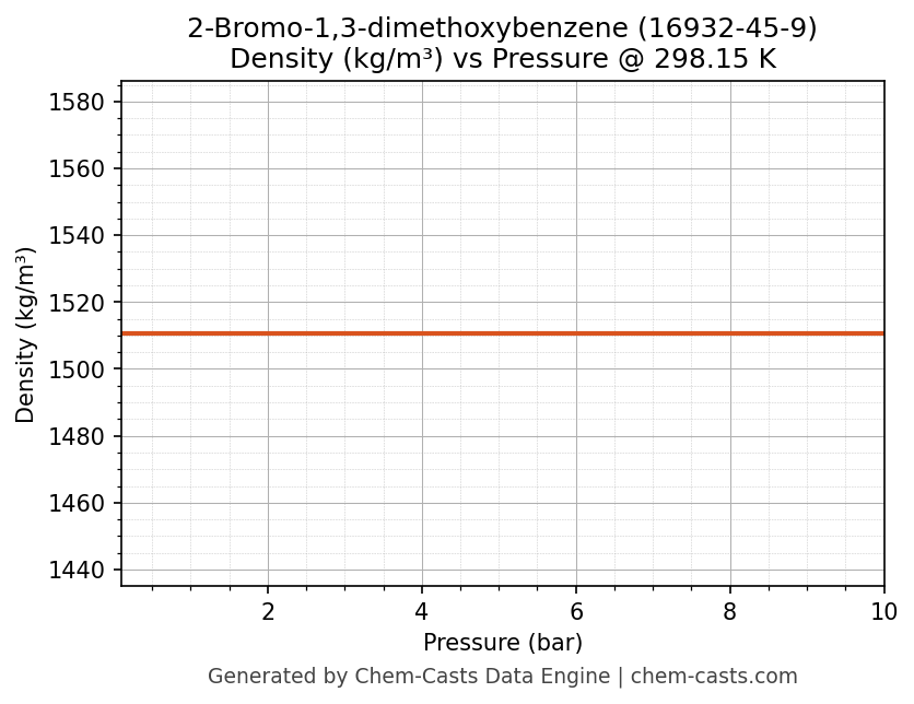 This page presents the pressure-dependent thermodynamic and transport properties of 2-Bromo-1,3-dimethoxybenzene (CAS 16932-45-9) calculated at a constant temperature of 298 K (25 °C) over the pressure range 0.10-10 bar.
