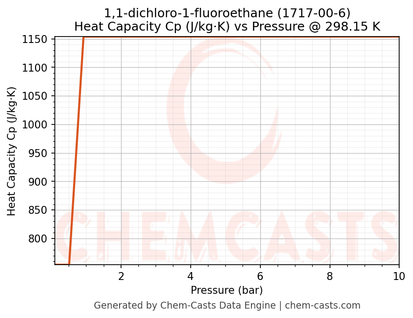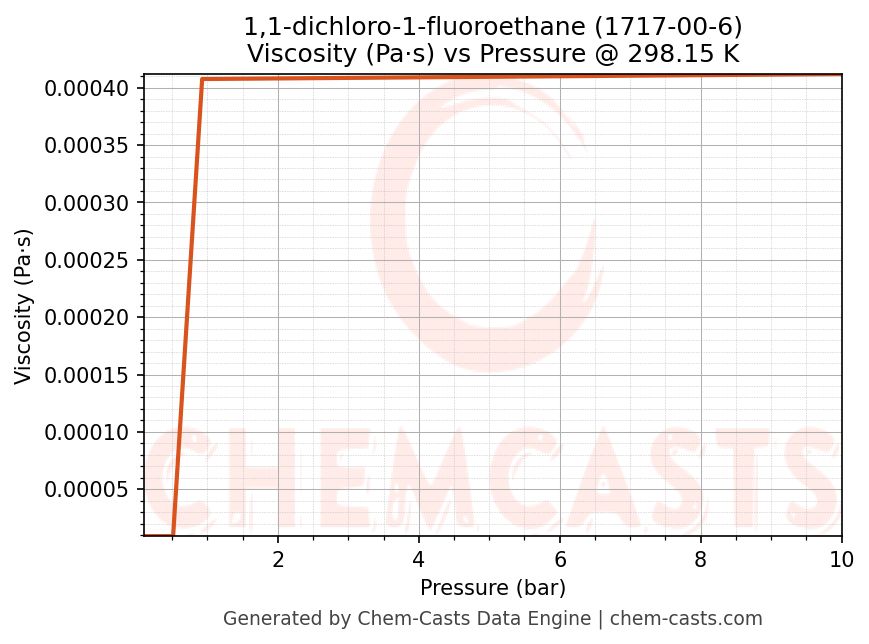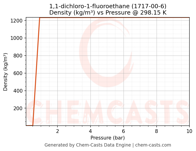This page presents the pressure-dependent thermodynamic and transport properties of 1,1-dichloro-1-fluoroethane (CAS 1717-00-6) calculated at a constant temperature of 298 K (25 °C) over the pressure range 0.10-10 bar.