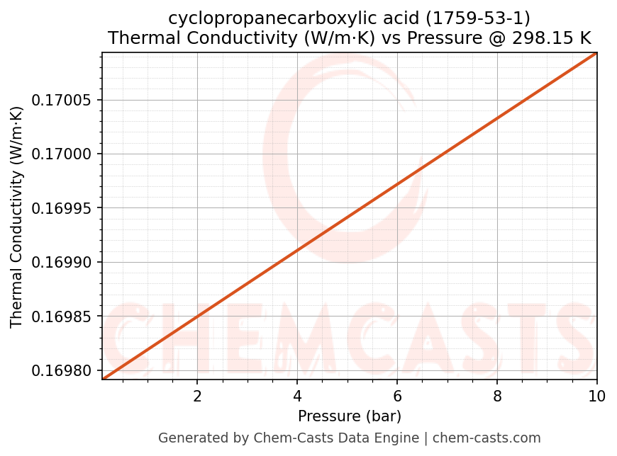 This page presents the pressure-dependent thermodynamic and transport properties of cyclopropanecarboxylic acid (CAS 1759-53-1) calculated at a constant temperature of 298 K (25 °C) over the pressure range 0.10-10 bar.