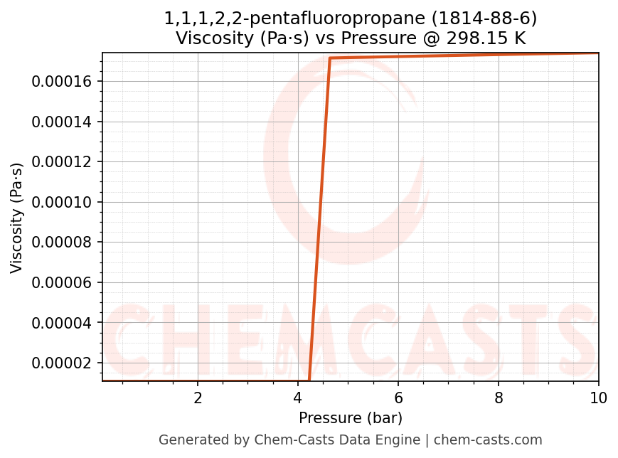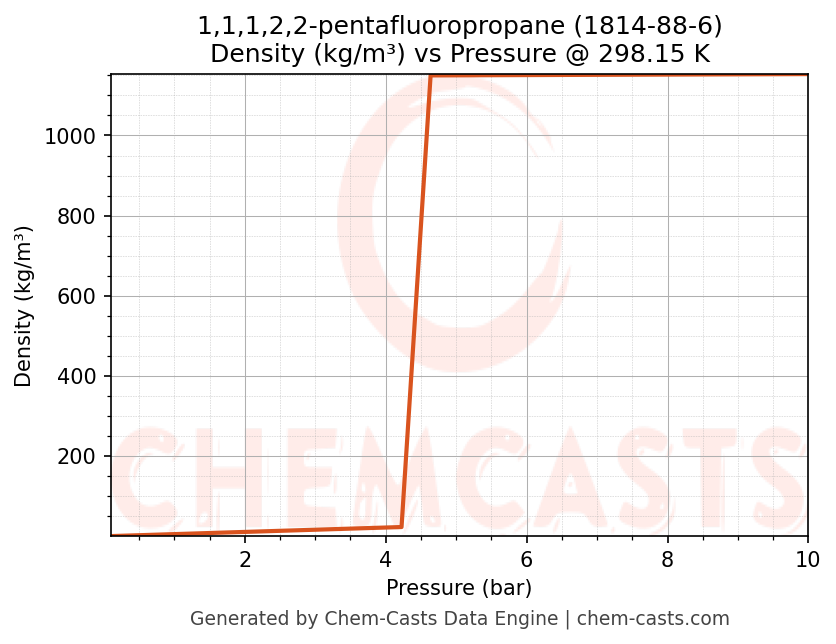 This page presents the pressure-dependent thermodynamic and transport properties of 1,1,1,2,2-pentafluoropropane (CAS 1814-88-6) calculated at a constant temperature of 298 K (25 °C) over the pressure range 0.10-10 bar.