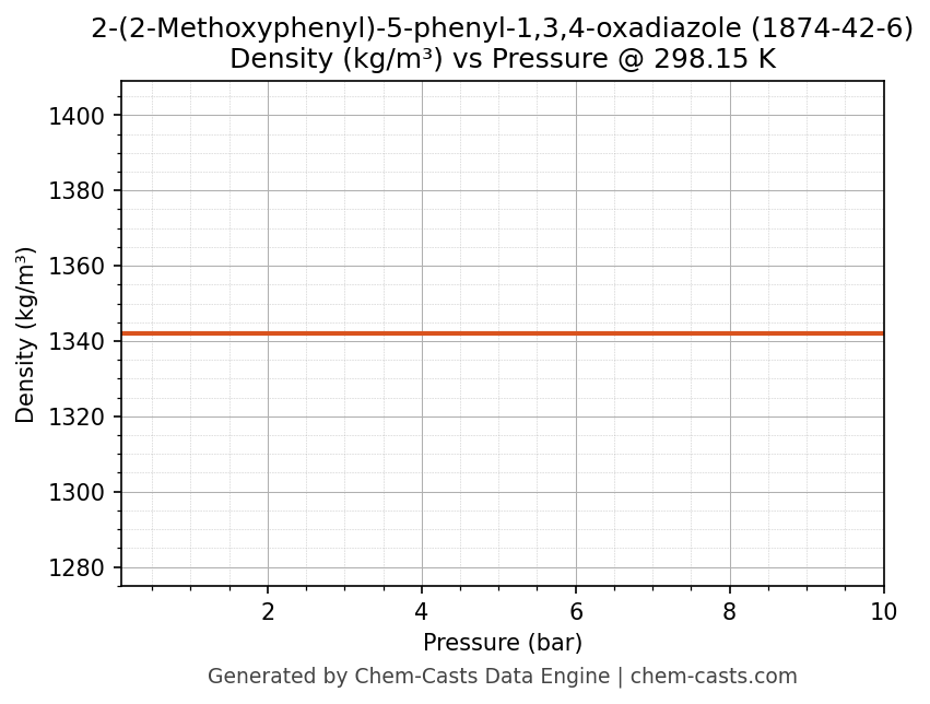 This page presents the pressure-dependent thermodynamic and transport properties of 2-(2-Methoxyphenyl)-5-phenyl-1,3,4-oxadiazole (CAS 1874-42-6) calculated at a constant temperature of 298 K (25 °C) over the pressure range 0.10-10 bar.