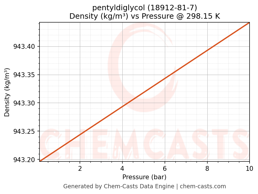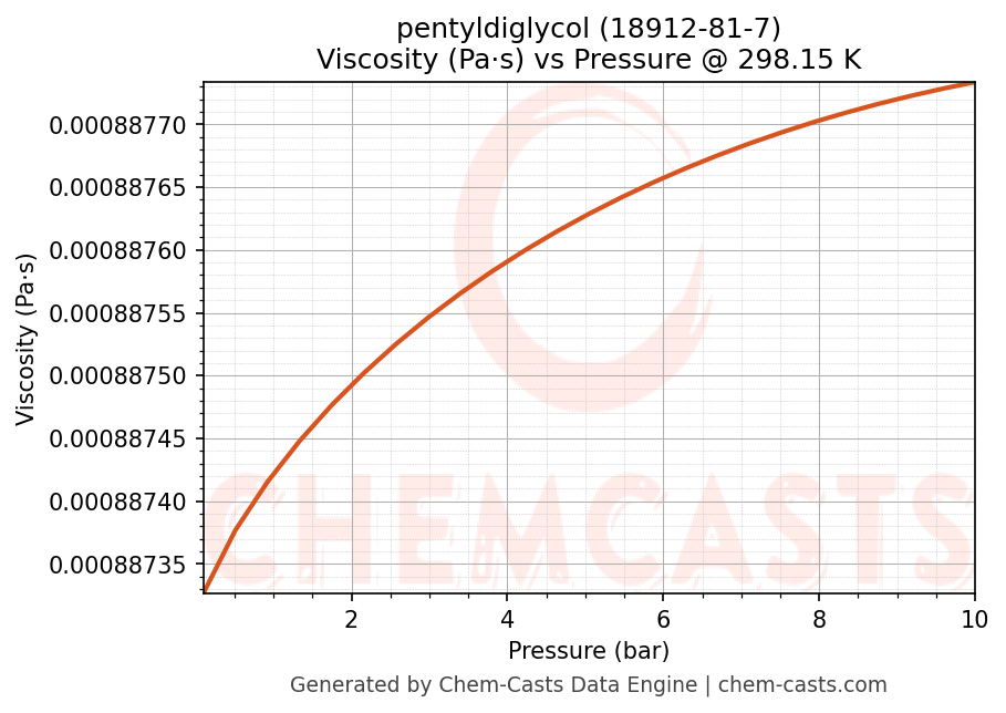 This page presents the pressure-dependent thermodynamic and transport properties of pentyldiglycol (CAS 18912-81-7) calculated at a constant temperature of 298 K (25 °C) over the pressure range 0.10-10 bar.
