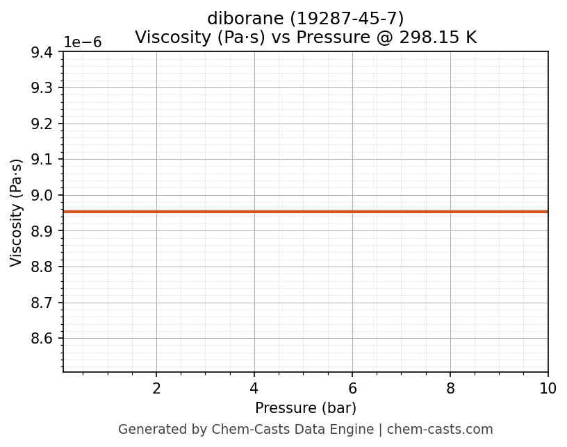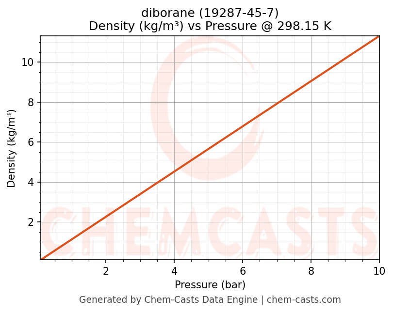 This page presents the pressure-dependent thermodynamic and transport properties of diborane (CAS 19287-45-7) calculated at a constant temperature of 298 K (25 °C) over the pressure range 0.10-10 bar.
