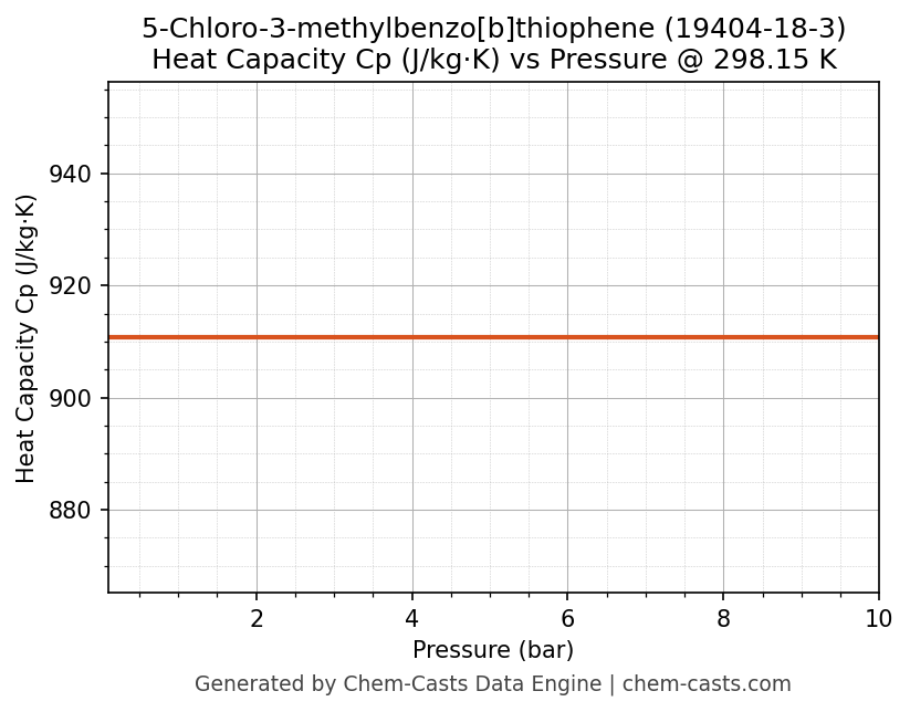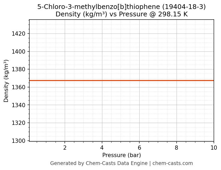 This page presents the pressure-dependent thermodynamic and transport properties of 5-Chloro-3-methylbenzo[b]thiophene (CAS 19404-18-3) calculated at a constant temperature of 298 K (25 °C) over the pressure range 0.10-10 bar.