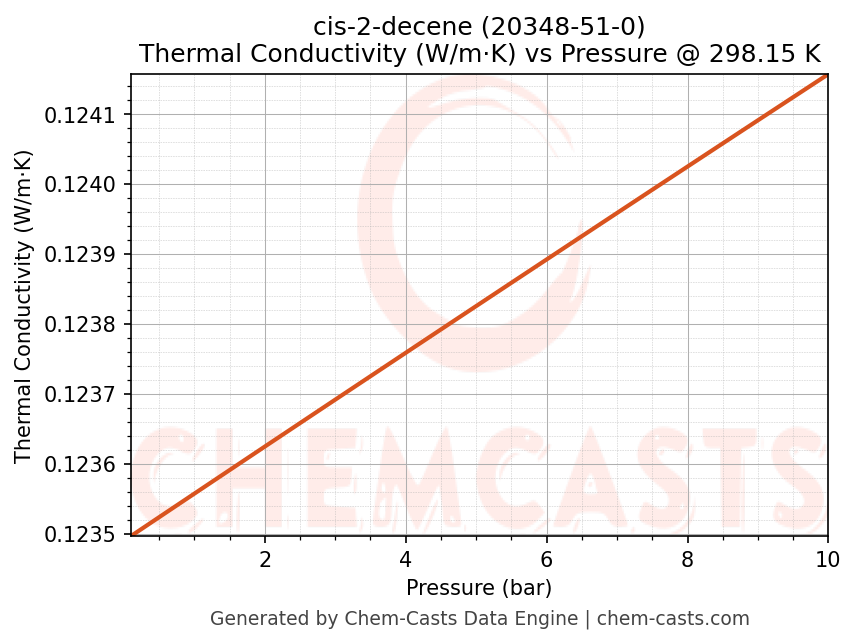 This page presents the pressure-dependent thermodynamic and transport properties of cis-2-decene (CAS 20348-51-0) calculated at a constant temperature of 298 K (25 °C) over the pressure range 0.10-10 bar.