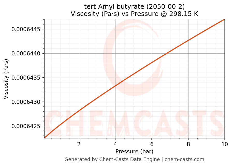 This page presents the pressure-dependent thermodynamic and transport properties of tert-Amyl butyrate (CAS 2050-00-2) calculated at a constant temperature of 298 K (25 °C) over the pressure range 0.10-10 bar.