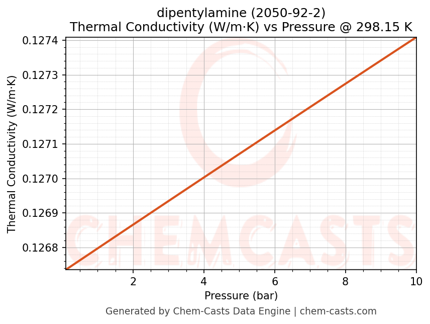This page presents the pressure-dependent thermodynamic and transport properties of dipentylamine (CAS 2050-92-2) calculated at a constant temperature of 298 K (25 °C) over the pressure range 0.10-10 bar.