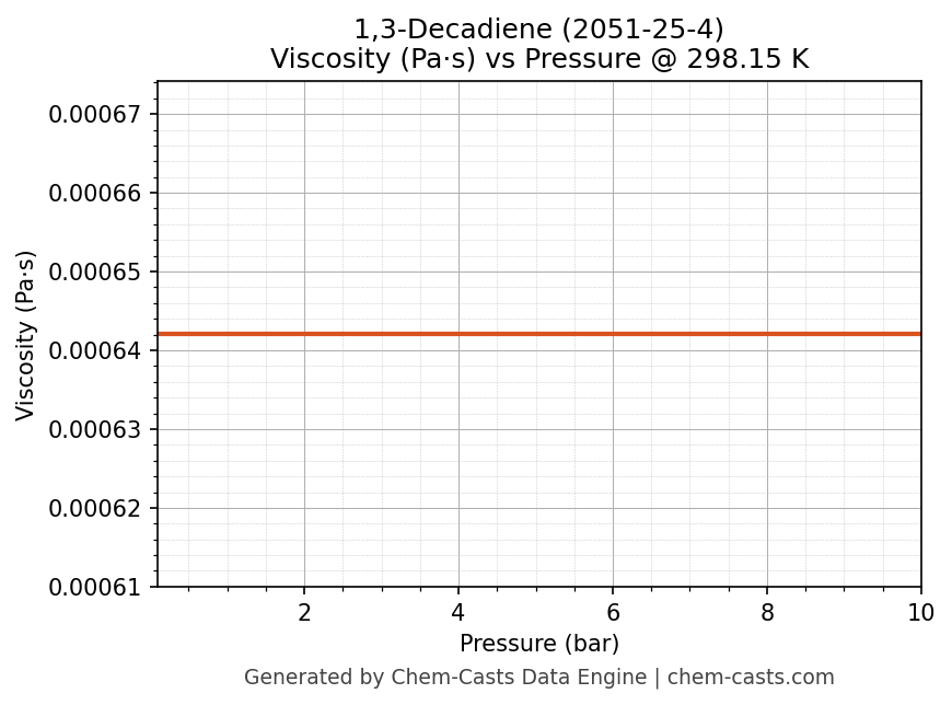 This page presents the pressure-dependent thermodynamic and transport properties of 1,3-Decadiene (CAS 2051-25-4) calculated at a constant temperature of 298 K (25 °C) over the pressure range 0.10-10 bar.