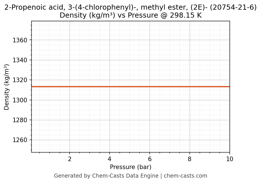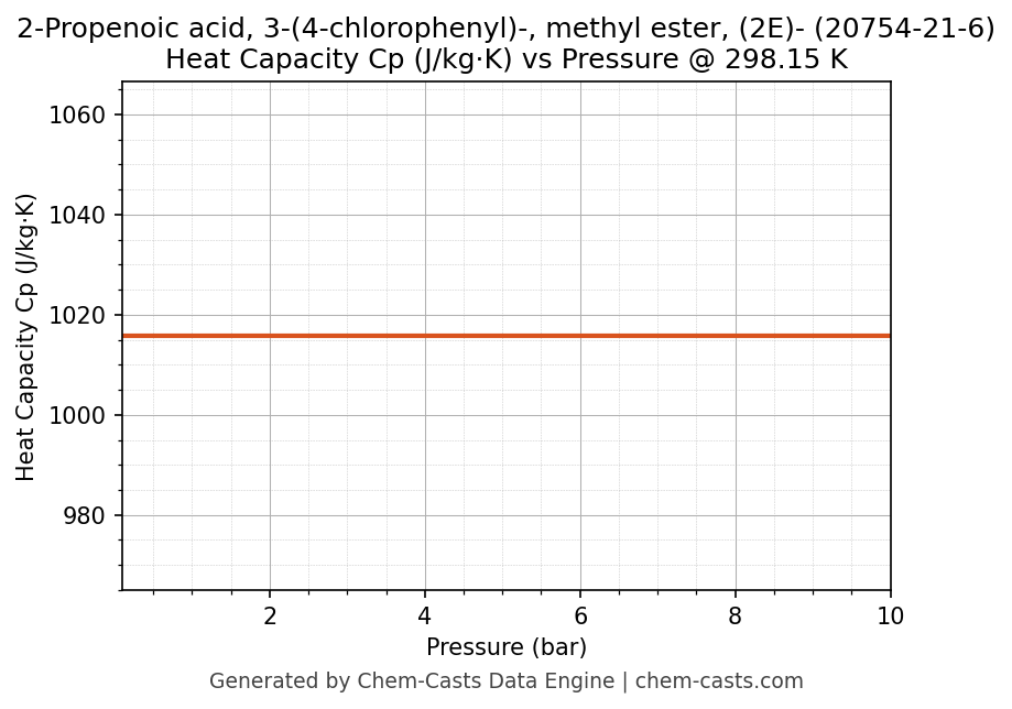 This page presents the pressure-dependent thermodynamic and transport properties of 2-Propenoic acid, 3-(4-chlorophenyl)-, methyl ester, (2E)- (CAS 20754-21-6) calculated at a constant temperature of 298 K (25 °C) over the pressure range 0.10-10 bar.