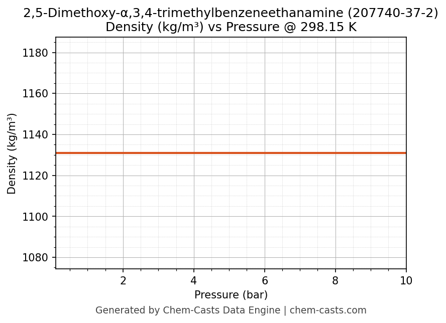 This page presents the pressure-dependent thermodynamic and transport properties of 2,5-Dimethoxy-α,3,4-trimethylbenzeneethanamine (CAS 207740-37-2) calculated at a constant temperature of 298 K (25 °C) over the pressure range 0.10-10 bar.