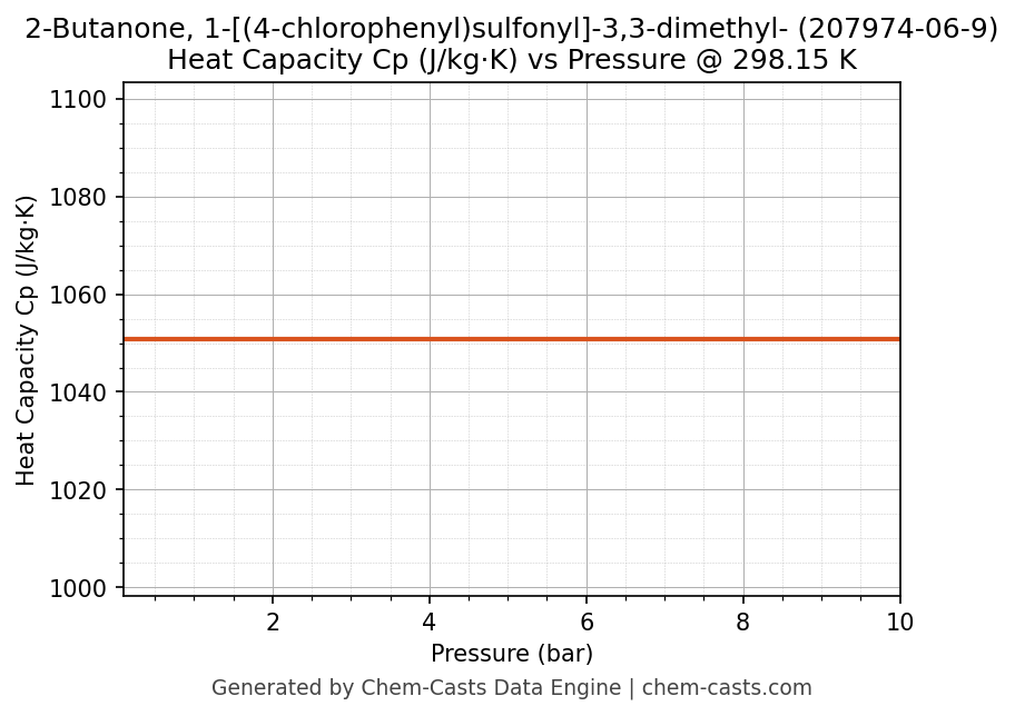 This page presents the pressure-dependent thermodynamic and transport properties of 2-Butanone, 1-[(4-chlorophenyl)sulfonyl]-3,3-dimethyl- (CAS 207974-06-9) calculated at a constant temperature of 298 K (25 °C) over the pressure range 0.10-10 bar.
