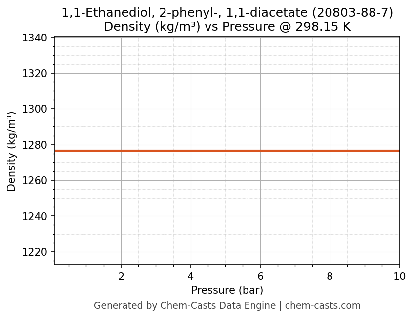 This page presents the pressure-dependent thermodynamic and transport properties of 1,1-Ethanediol, 2-phenyl-, 1,1-diacetate (CAS 20803-88-7) calculated at a constant temperature of 298 K (25 °C) over the pressure range 0.10-10 bar.