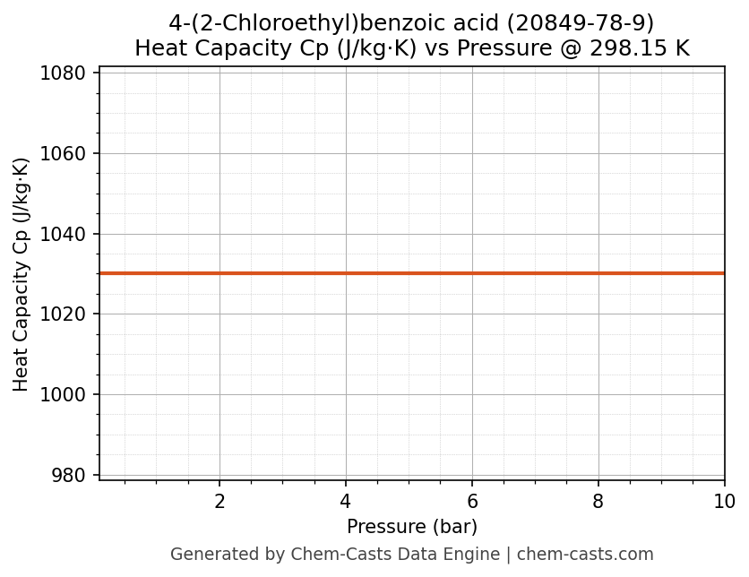 This page presents the pressure-dependent thermodynamic and transport properties of 4-(2-Chloroethyl)benzoic acid (CAS 20849-78-9) calculated at a constant temperature of 298 K (25 °C) over the pressure range 0.10-10 bar.