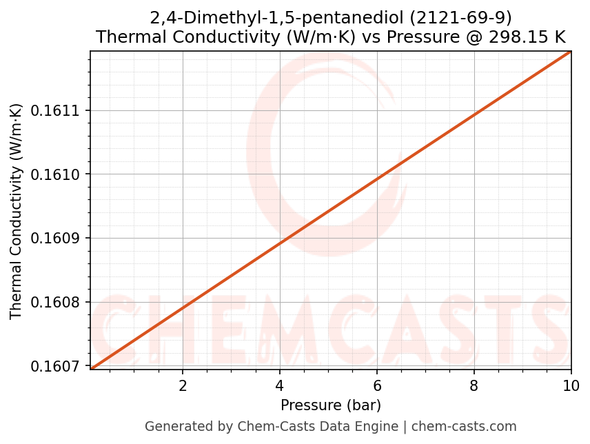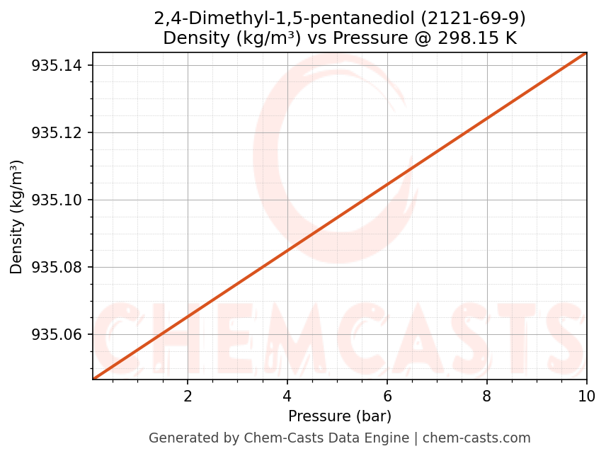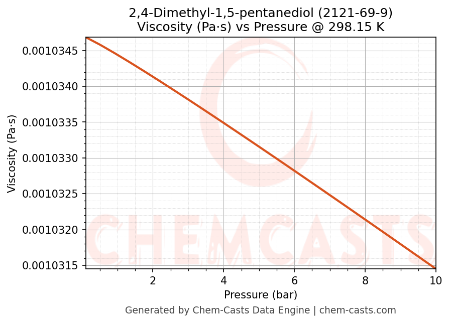 This page presents the pressure-dependent thermodynamic and transport properties of 2,4-Dimethyl-1,5-pentanediol (CAS 2121-69-9) calculated at a constant temperature of 298 K (25 °C) over the pressure range 0.10-10 bar.