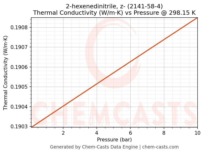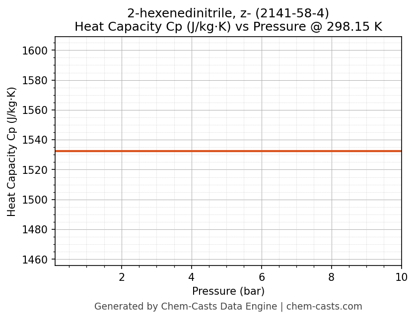This page presents the pressure-dependent thermodynamic and transport properties of 2-hexenedinitrile, z- (CAS 2141-58-4) calculated at a constant temperature of 298 K (25 °C) over the pressure range 0.10-10 bar.