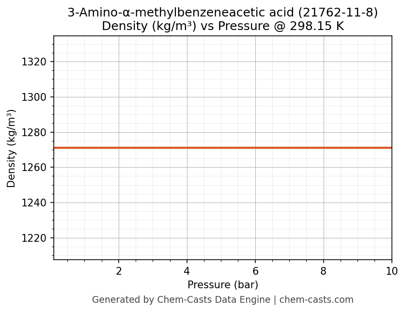 This page presents the pressure-dependent thermodynamic and transport properties of 3-Amino-α-methylbenzeneacetic acid (CAS 21762-11-8) calculated at a constant temperature of 298 K (25 °C) over the pressure range 0.10-10 bar.