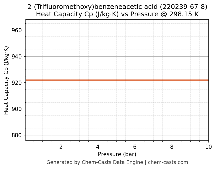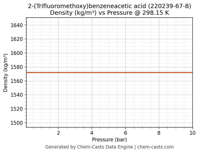 This page presents the pressure-dependent thermodynamic and transport properties of 2-(Trifluoromethoxy)benzeneacetic acid (CAS 220239-67-8) calculated at a constant temperature of 298 K (25 °C) over the pressure range 0.10-10 bar.