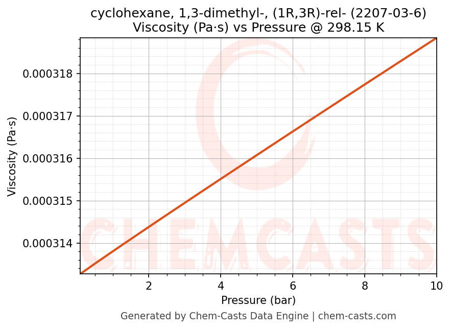 This page presents the pressure-dependent thermodynamic and transport properties of cyclohexane, 1,3-dimethyl-, (1R,3R)-rel- (CAS 2207-03-6) calculated at a constant temperature of 298 K (25 °C) over the pressure range 0.10-10 bar.
