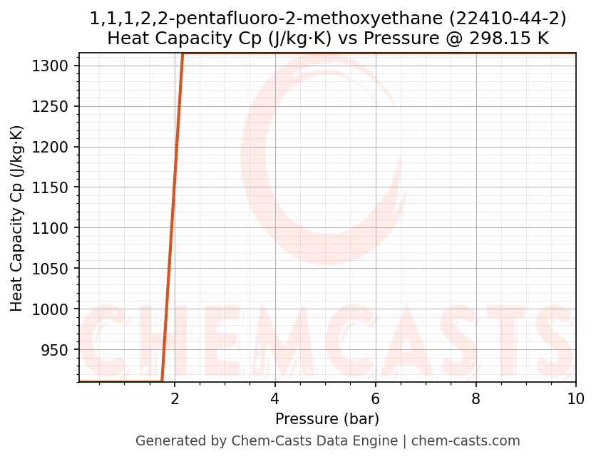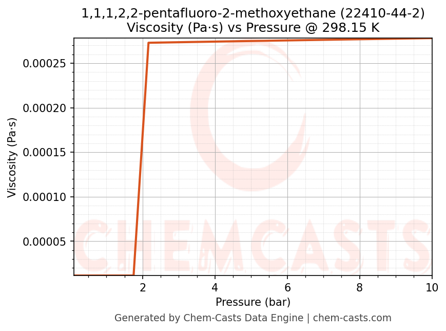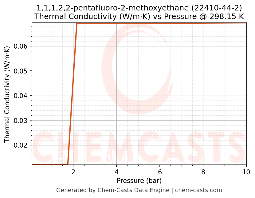 This page presents the pressure-dependent thermodynamic and transport properties of 1,1,1,2,2-pentafluoro-2-methoxyethane (CAS 22410-44-2) calculated at a constant temperature of 298 K (25 °C) over the pressure range 0.10-10 bar.