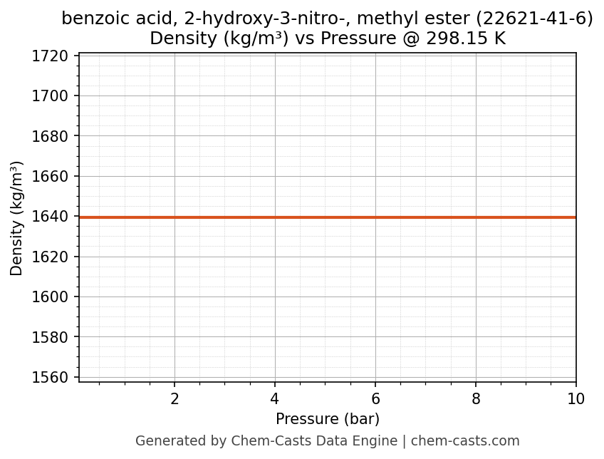This page presents the pressure-dependent thermodynamic and transport properties of benzoic acid, 2-hydroxy-3-nitro-, methyl ester (CAS 22621-41-6) calculated at a constant temperature of 298 K (25 °C) over the pressure range 0.10-10 bar.