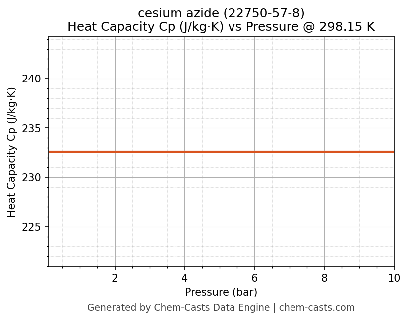 This page presents the pressure-dependent thermodynamic and transport properties of cesium azide (CAS 22750-57-8) calculated at a constant temperature of 298 K (25 °C) over the pressure range 0.10-10 bar.