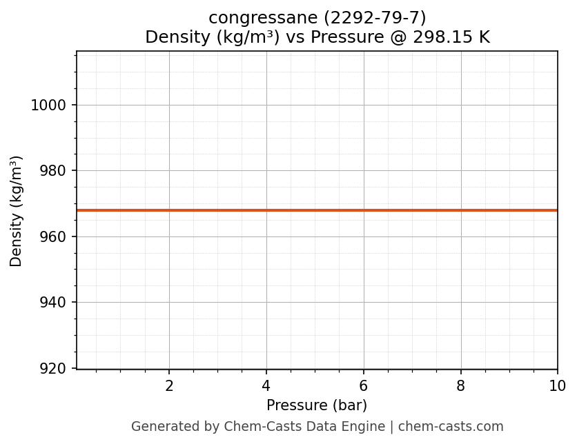 This page presents the pressure-dependent thermodynamic and transport properties of congressane (CAS 2292-79-7) calculated at a constant temperature of 298 K (25 °C) over the pressure range 0.10-10 bar.