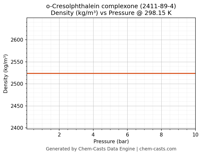 This page presents the pressure-dependent thermodynamic and transport properties of o-Cresolphthalein complexone (CAS 2411-89-4) calculated at a constant temperature of 298 K (25 °C) over the pressure range 0.10-10 bar.