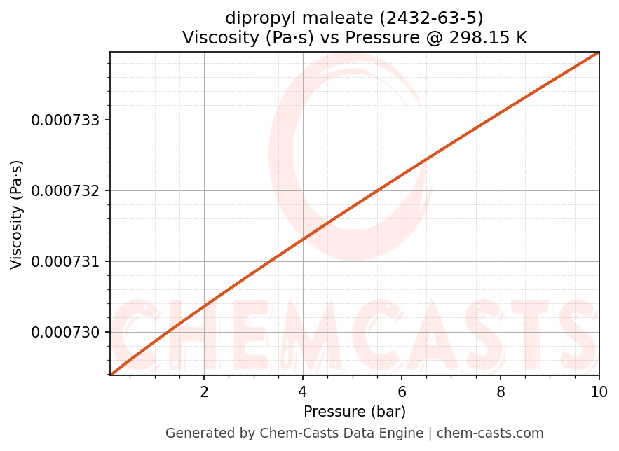 This page presents the pressure-dependent thermodynamic and transport properties of dipropyl maleate (CAS 2432-63-5) calculated at a constant temperature of 298 K (25 °C) over the pressure range 0.10-10 bar.