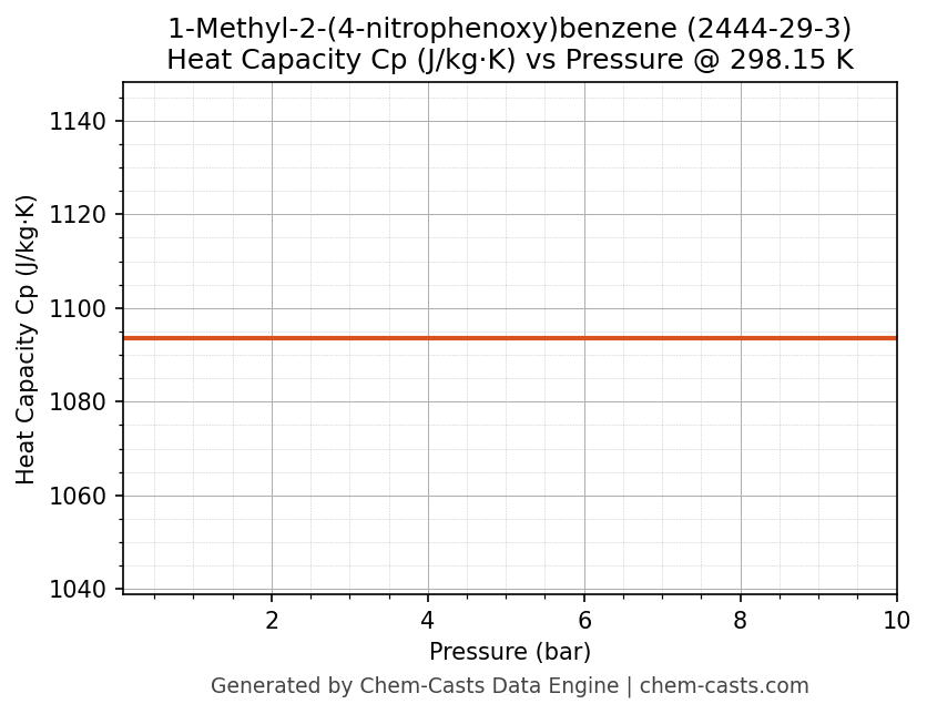 This page presents the pressure-dependent thermodynamic and transport properties of 1-Methyl-2-(4-nitrophenoxy)benzene (CAS 2444-29-3) calculated at a constant temperature of 298 K (25 °C) over the pressure range 0.10-10 bar.