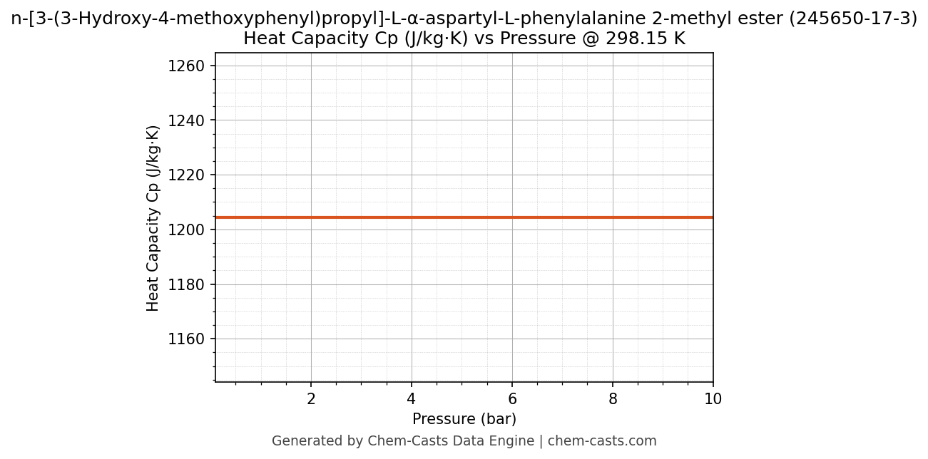 This page presents the pressure-dependent thermodynamic and transport properties of n-[3-(3-Hydroxy-4-methoxyphenyl)propyl]-L-α-aspartyl-L-phenylalanine 2-methyl ester (CAS 245650-17-3) calculated at a constant temperature of 298 K (25 °C) over the pressure range 0.10-10 bar.
