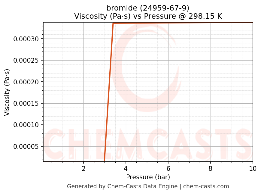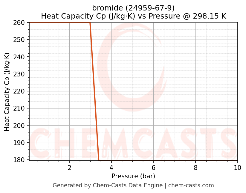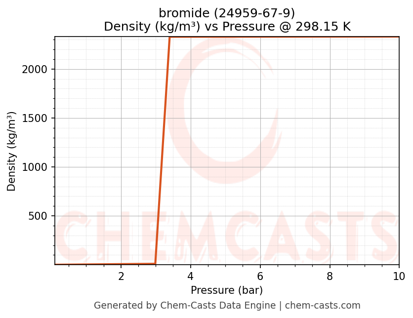 This page presents the pressure-dependent thermodynamic and transport properties of bromide (CAS 24959-67-9) calculated at a constant temperature of 298 K (25 °C) over the pressure range 0.10-10 bar.