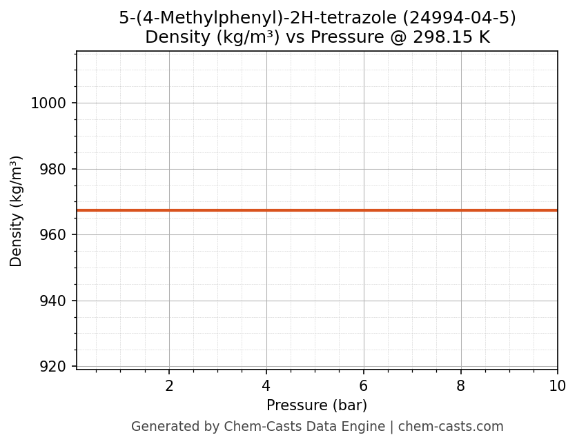 This page presents the pressure-dependent thermodynamic and transport properties of 5-(4-Methylphenyl)-2H-tetrazole (CAS 24994-04-5) calculated at a constant temperature of 298 K (25 °C) over the pressure range 0.10-10 bar.