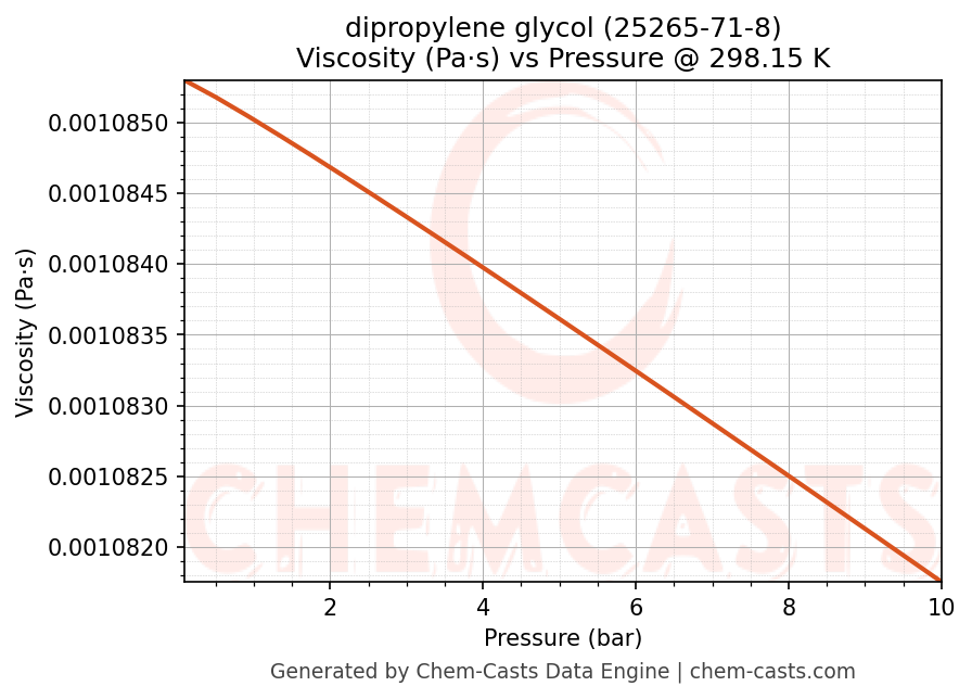 This page presents the pressure-dependent thermodynamic and transport properties of dipropylene glycol (CAS 25265-71-8) calculated at a constant temperature of 298 K (25 °C) over the pressure range 0.10-10 bar.