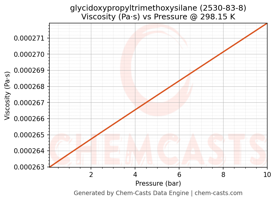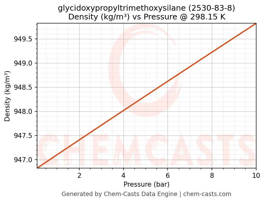 This page presents the pressure-dependent thermodynamic and transport properties of glycidoxypropyltrimethoxysilane (CAS 2530-83-8) calculated at a constant temperature of 298 K (25 °C) over the pressure range 0.10-10 bar.