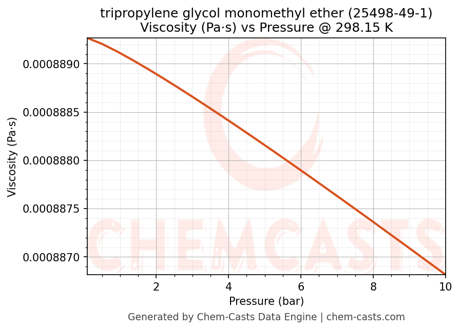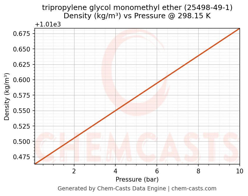 This page presents the pressure-dependent thermodynamic and transport properties of tripropylene glycol monomethyl ether (CAS 25498-49-1) calculated at a constant temperature of 298 K (25 °C) over the pressure range 0.10-10 bar.
