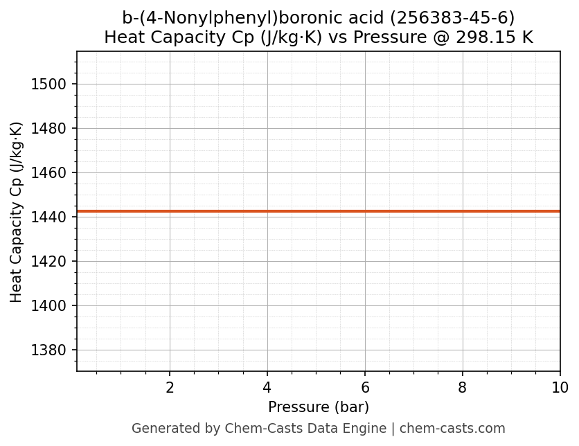 This page presents the pressure-dependent thermodynamic and transport properties of b-(4-Nonylphenyl)boronic acid (CAS 256383-45-6) calculated at a constant temperature of 298 K (25 °C) over the pressure range 0.10-10 bar.