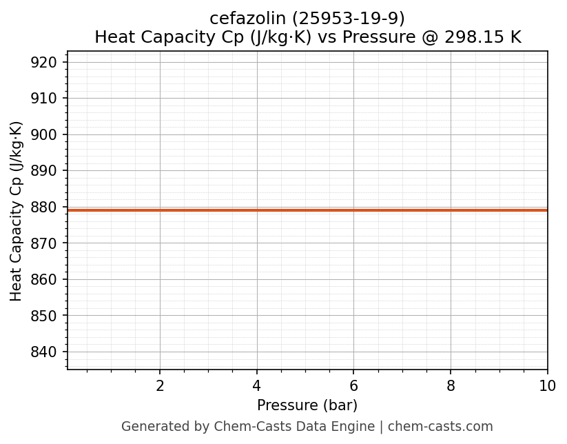 This page presents the pressure-dependent thermodynamic and transport properties of cefazolin (CAS 25953-19-9) calculated at a constant temperature of 298 K (25 °C) over the pressure range 0.10-10 bar.