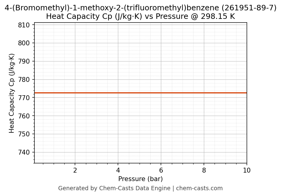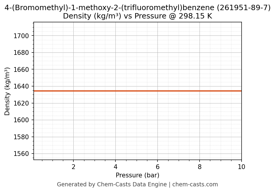 This page presents the pressure-dependent thermodynamic and transport properties of 4-(Bromomethyl)-1-methoxy-2-(trifluoromethyl)benzene (CAS 261951-89-7) calculated at a constant temperature of 298 K (25 °C) over the pressure range 0.10-10 bar.