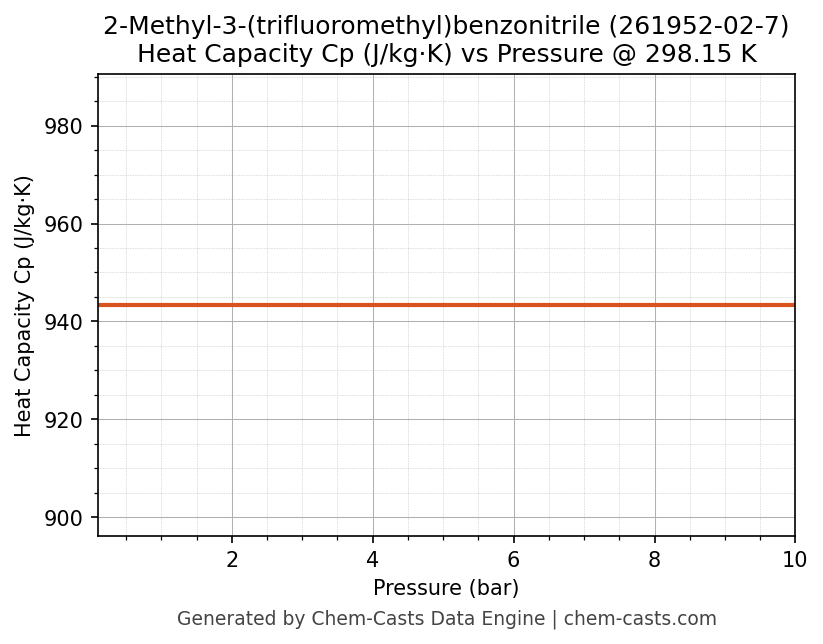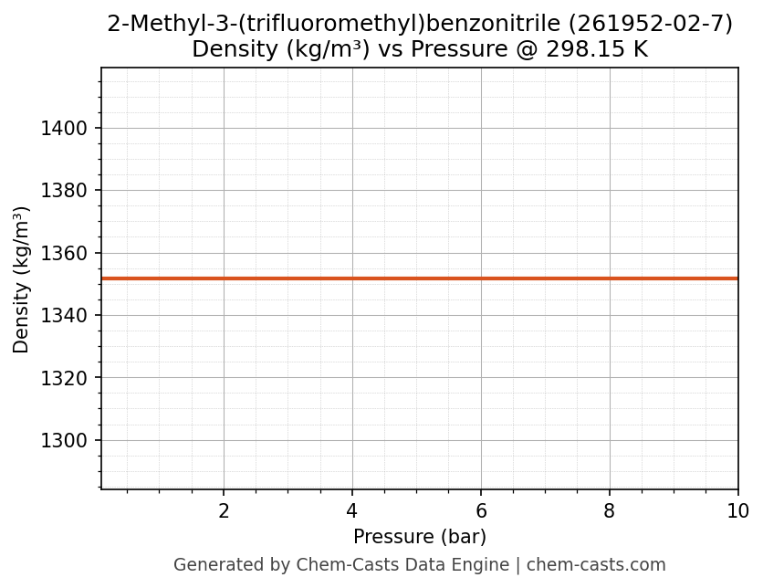 This page presents the pressure-dependent thermodynamic and transport properties of 2-Methyl-3-(trifluoromethyl)benzonitrile (CAS 261952-02-7) calculated at a constant temperature of 298 K (25 °C) over the pressure range 0.10-10 bar.