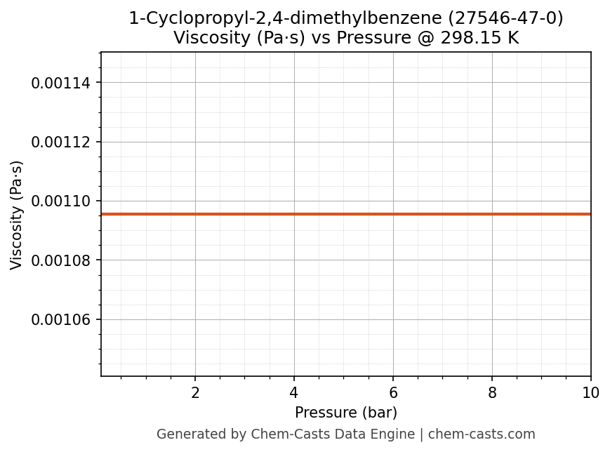 This page presents the pressure-dependent thermodynamic and transport properties of 1-Cyclopropyl-2,4-dimethylbenzene (CAS 27546-47-0) calculated at a constant temperature of 298 K (25 °C) over the pressure range 0.10-10 bar.