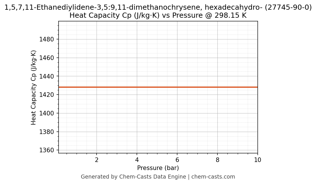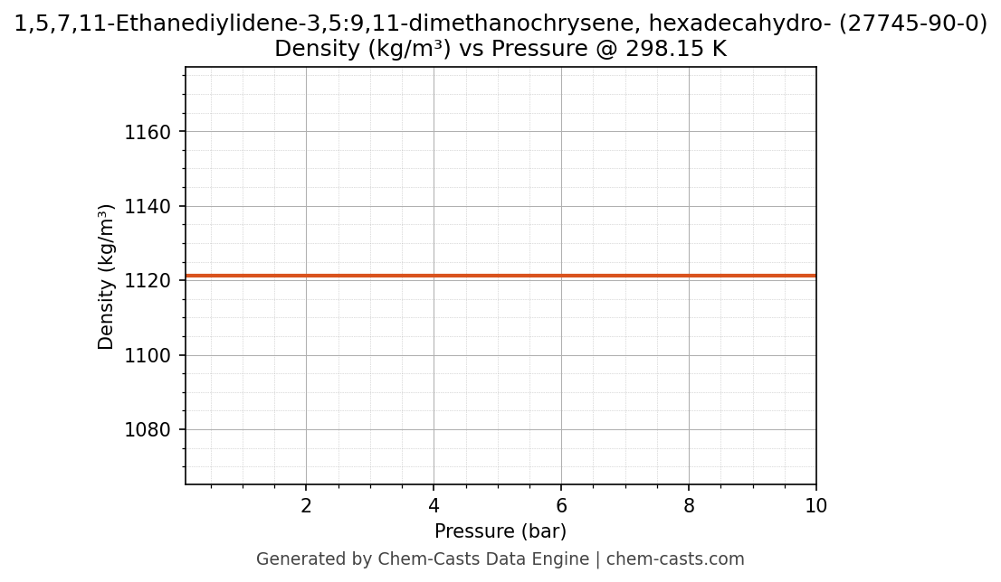 This page presents the pressure-dependent thermodynamic and transport properties of 1,5,7,11-Ethanediylidene-3,5:9,11-dimethanochrysene, hexadecahydro- (CAS 27745-90-0) calculated at a constant temperature of 298 K (25 °C) over the pressure range 0.10-10 bar.